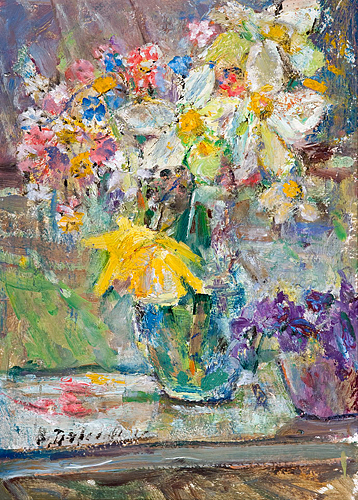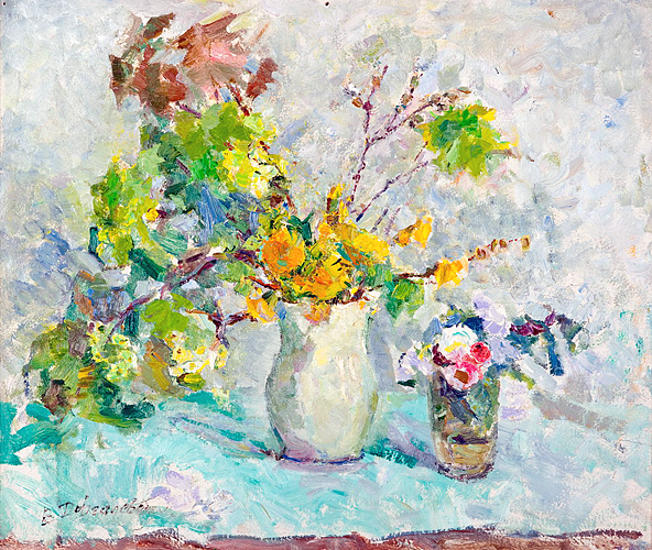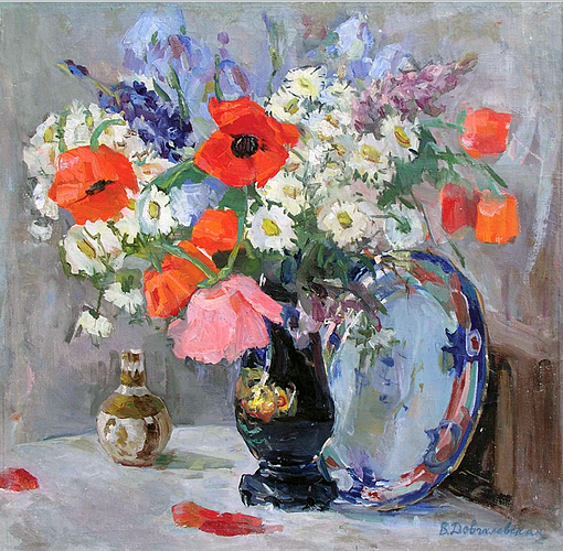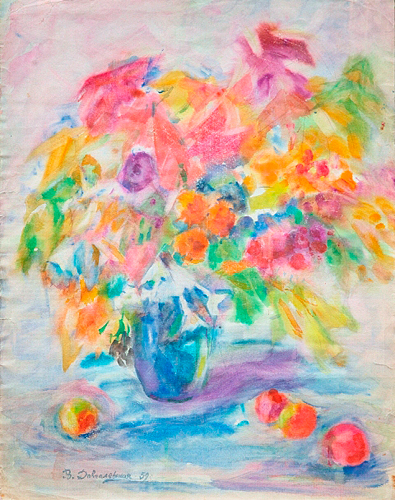 Click on image to enlarge "Vira Dovgalevska". Paintings: Booklet. Kyiv, "PC World Ukraine" price on request Выставка работ Dovgalevskaya V.V. :: Dahlias :: 1969, 80х100, oil on canvas Dovgalevskaya V.V. :: Still life with spidola :: 1960 Dovgalevskaya V.V. :: Flowers :: 50х40, 1980-th, oil on cardboard Dovgalevskaya V.V. :: Autumn flowers :: 1950-th, 79х74, oil on canvas Dovgalevskaya V.V. :: Still life with a toy :: 1980-th, 35,5х49,5, oil on cardboard Dovgalevskaya V.V. :: Young girl :: 1967, 75х63, fiberboard, pastel Dovgalevskaya V.V. :: Girl :: ladt quarter of the ХХ century, 68х51, pastel on paper Dovgalevskaya V.V. :: Flowers :: 1959, 50х60, oil on canvas Dovgalevskaya V.V. :: Asters :: 73,5х49, oil on cardboard Dovgalevskaya V.V. :: Golden autumn :: 49,5х70, oil on canvas Dovgalevskaya V.V. :: Poppies :: 1953, 59х60, oil on canvas Dovgalevskaya V.V. :: Flowers :: 58х40, oil on cardboard Dovgalevskaya V.V. :: Lilac :: 67x87, oil on cardboard Dovgalevskaya V.V. :: Tendreness :: 1959, 65x50, watercolor on paper Dovgalevskaya V.V. :: Girl in a red beret :: 1969, 47x35, watercolor on paper Dovgalevskaya V.V. :: Bouquet of flowers :: 39x27, oil on cardboard Dovgalevskaya V.V. :: Still life with flowers :: 1950, 40х50 , oil on cardboard Dovgalevskaya V.V. :: Spring still life :: 1981, 50х59, oil on cardboard Dovgalevskaya V.V. :: Still life :: 34х25, oil on cardboard Dovgalevskaya V.V. :: Still Life with a plate :: 1970-th, 50х35, canvas on cardboard, oil Dovgalevskaya V.V. :: Still life with wildflowers :: 1960-th, 62х60, oil on canvas Dovgalevskaya V.V. :: Portrait of a woman :: 1960-th, 46х33, oil on cardboard 300$ Dovgalevskaya V.V. :: Tulips :: 61х69, oil on canvas