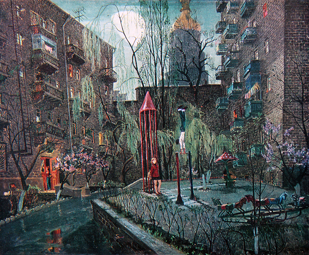 Но главная тема творчества художника — человек и город, его картинам и графике присущи лиризм, элементы фантастики и, вместе с тем, точность в деталях изображения.