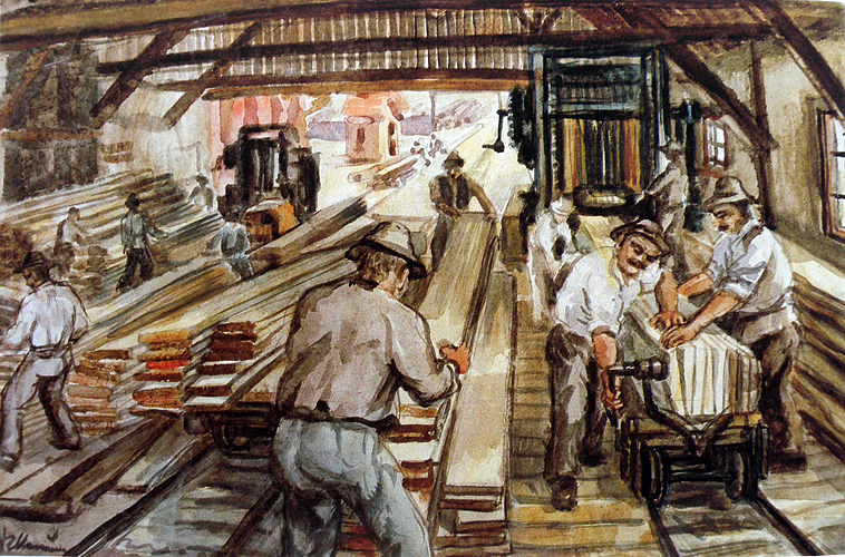 Манайло Ф.Ф. :: Лесопилка :: 1946 год, 38х58, бумага, акварель |