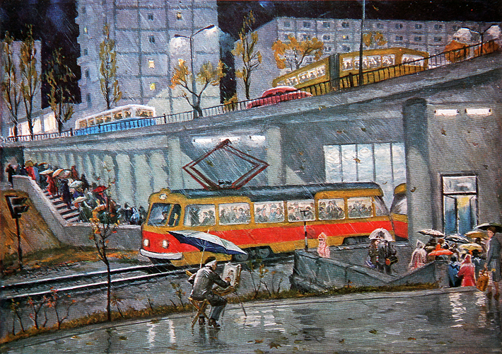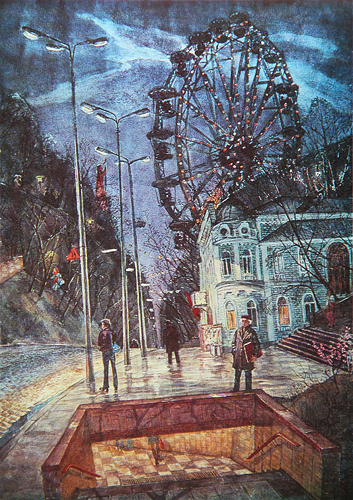Но главная тема творчества художника — человек и город, его картинам и графике присущи лиризм, элементы фантастики и, вместе с тем, точность в деталях изображения.