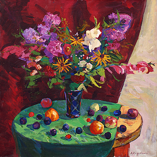 Ходченко Л.П. :: Цветы на столе с зеленой скатертью ::